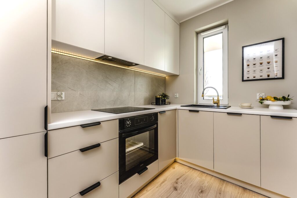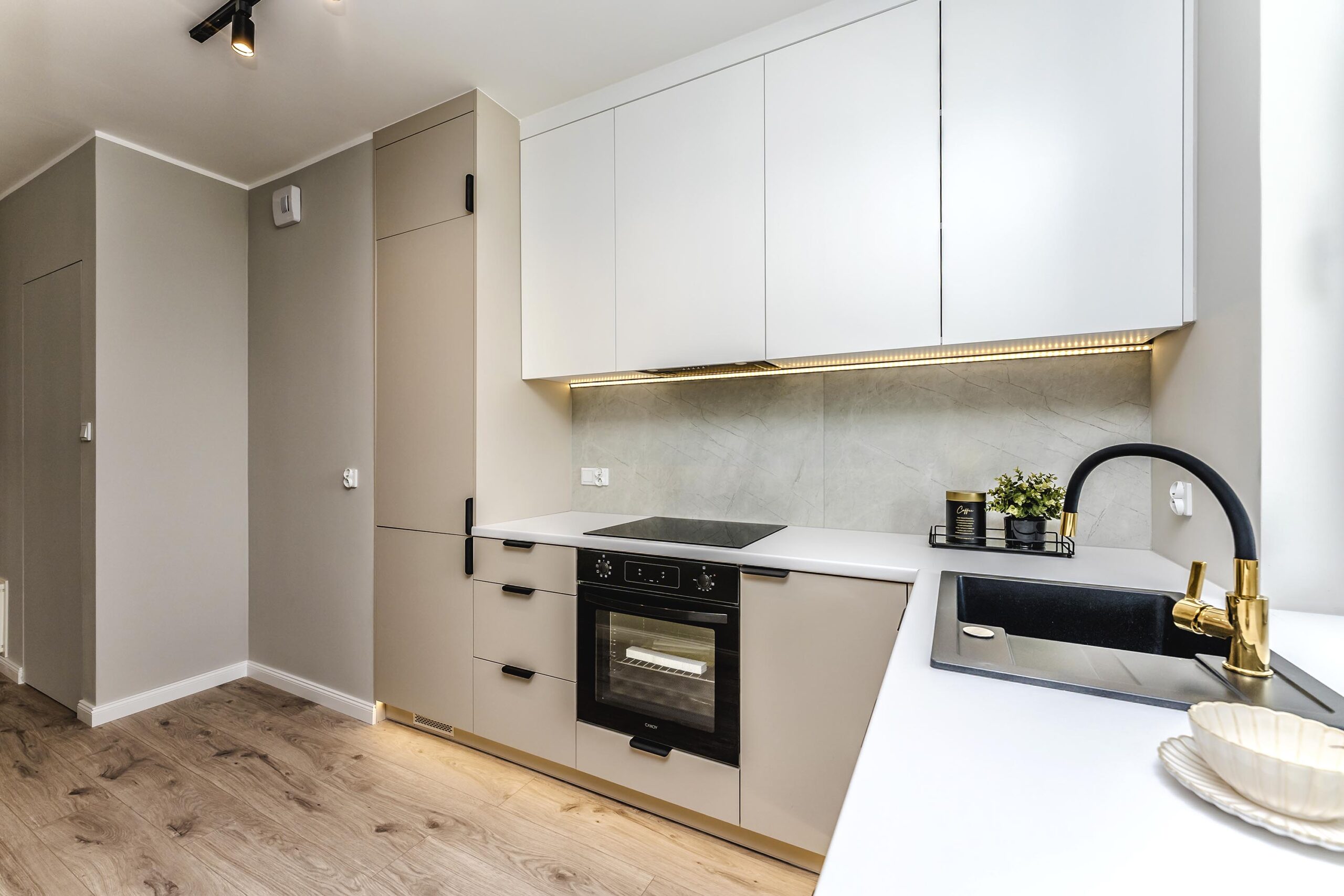Cena obejmuje pełne wyposażenie mieszkania (zabudowa kuchenna stała (wykonana na zamówienie) wraz ze sprzętem AGD: lodówko-zamrażarka, zmywarka, płyta indukcyjna, piekarnik, pochłaniacz oparów) .
